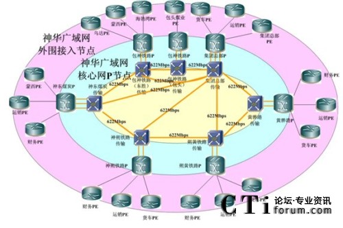 據(jù)神華集團(tuán)信息管理部廣域網(wǎng)項(xiàng)目負(fù)責(zé)人說:“該項(xiàng)目建成后將是一個(gè)建設(shè)在高速傳輸網(wǎng)平臺(tái)之上,并利用其提供的線路構(gòu)成廣域網(wǎng)核心節(jié)點(diǎn)之間的互聯(lián)線路,網(wǎng)絡(luò)拓?fù)湓?個(gè)核心節(jié)點(diǎn)和以北京節(jié)點(diǎn)為中心直連7個(gè)核心節(jié)點(diǎn)的放射型622M環(huán)形+放射混合性企業(yè)頂級(jí)骨干廣域數(shù)據(jù)網(wǎng)絡(luò)結(jié)構(gòu)。該網(wǎng)絡(luò)結(jié)構(gòu)可避免任一段光纜中斷造成某節(jié)點(diǎn)直連線路和環(huán)線同時(shí)中斷的可能性,即對(duì)網(wǎng)絡(luò)單點(diǎn)故障實(shí)現(xiàn)環(huán)路保護(hù)。同時(shí),網(wǎng)絡(luò)中斷到恢復(fù)的周期大大縮短:傳輸系統(tǒng)中SDH的環(huán)路自愈從中斷到恢復(fù)周期為50ms,網(wǎng)絡(luò)節(jié)點(diǎn)之間通過IGP的路由收斂,從中斷到恢復(fù)的周期約為200ms。”