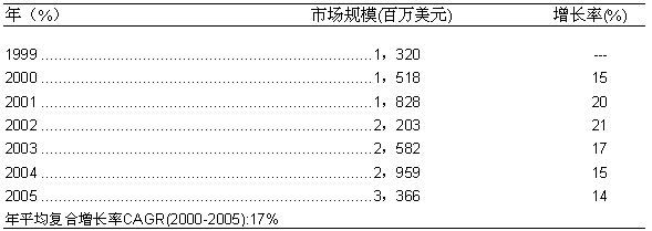如圖一所示,1999年,美國的固定網(wǎng)OSS服務(wù)保障的市場規(guī)模約為13.2億美元。而在2000年,這一市場比上一年增長了15%,達(dá)到15.18億美元。根據(jù)Frost & Sullivan的預(yù)測,從2000年到2005年間,美國的固定網(wǎng)OSS服務(wù)保障市場的年平均復(fù)合增長率將高達(dá)17%,市場規(guī)模在2005年預(yù)計(jì)會(huì)增長至33.66億美元。