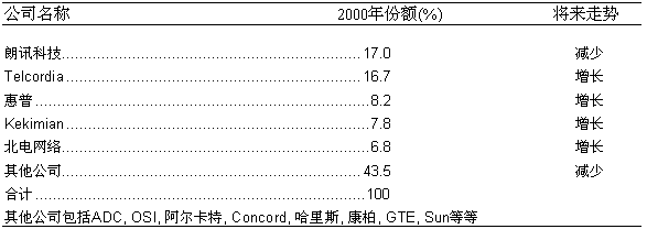 從目前市場情況來看,美國的固定網(wǎng)OSS服務(wù)保障的市場集中度相當(dāng)高。在市場中領(lǐng)先的公司一共有5家,它們分別是朗訊科技、Telcordia科技、惠普公司、Hekimian和北電網(wǎng)絡(luò)。這五家公司均是較早進(jìn)入這一市場的老牌公司。2000年,它們?cè)诠潭ňW(wǎng)OSS服務(wù)保障領(lǐng)域的銷售額總和為8.60億美元,約占整個(gè)市場的56.5%左右,另外43.5%的市場被約其他二十多家廠商分割。