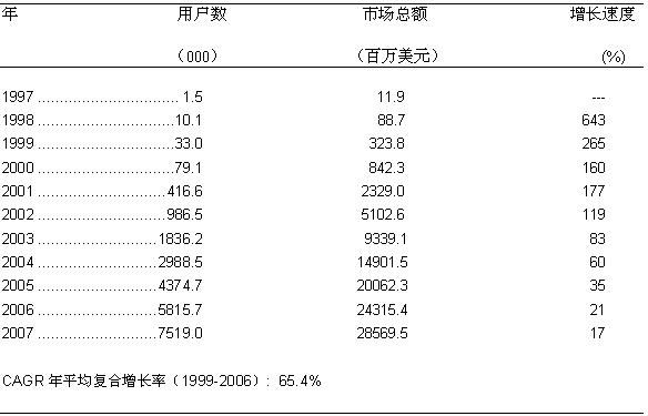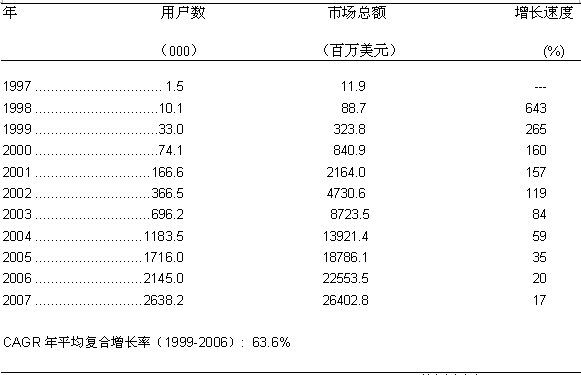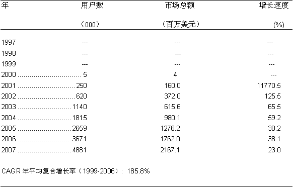 圖一: 美國寬帶無線固定接入市場的增長歷史和預(yù)測 1997-2007