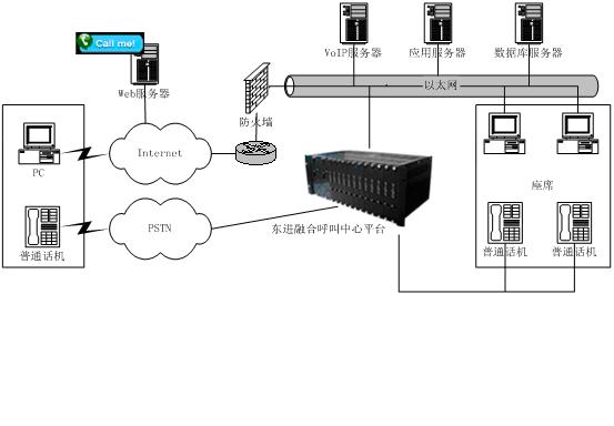 to Talk)”發(fā)展到“點(diǎn)擊到交談(Click to Talk)”,通過(guò)Internet可以提供IP電話(huà)語(yǔ)音呼叫、Call Back、IP傳真、IM、E-mail等功能,擴(kuò)展了通信渠道,一方面用戶(hù)可以實(shí)現(xiàn)免費(fèi)接入到呼叫中心,另一方面企業(yè)能夠向更多的客戶(hù)提供優(yōu)質(zhì)、方便的服務(wù)資源,而且由于這些資源的價(jià)格相對(duì)傳統(tǒng)通信便宜,使企業(yè)為客戶(hù)提供全國(guó)、乃至于全球服務(wù)成為可能,提高了企業(yè)客戶(hù)服務(wù)水平,增強(qiáng)了企業(yè)競(jìng)爭(zhēng)力。東進(jìn)互聯(lián)網(wǎng)呼叫中心系統(tǒng)結(jié)構(gòu)如圖所示: