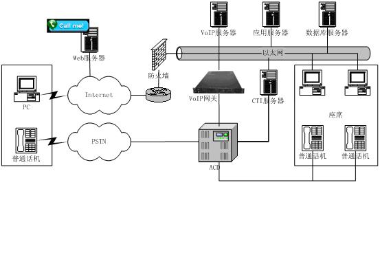 相對(duì)于傳統(tǒng)以PSTN網(wǎng)接入的呼叫中心,東進(jìn)互聯(lián)網(wǎng)呼叫中心增加了系統(tǒng)與Internet的接入,將原來(lái)由IVR完成的操作通過(guò)Web頁(yè)面上的流程實(shí)現(xiàn),這樣用戶(hù)通過(guò)下拉菜單、簡(jiǎn)單填寫(xiě)、點(diǎn)擊按鈕等操作完成客戶(hù)識(shí)別、業(yè)務(wù)識(shí)別等操作,這些流程完成后,通過(guò)VoIP對(duì)呼叫中心呼入,由呼叫中心對(duì)呼入進(jìn)行受理,再按照相應(yīng)的原則分配到座席,座席再作相應(yīng)的應(yīng)答和處理,從而為客戶(hù)提供了一個(gè)通過(guò)Web站點(diǎn)直接進(jìn)入呼叫中心的途徑,把Internet所具有的豐富信息資源和強(qiáng)大的功能賦予呼叫中心,它向客戶(hù)提供一個(gè)可訪問(wèn)的Web站點(diǎn),使得呼叫中心從“撥叫到交談(Dial