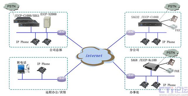 在公司總部采用EICP-S2000或EICP-C1000作為整個(gè)系統(tǒng)的核心服務(wù)器/控制器,并與PSTN電信網(wǎng)對(duì)接;在分公司、辦事處可采用SAG32、SAG8、C1000、Rc100作為集團(tuán)電話,也可直接采用IP話機(jī)作為桌面辦公電話。公司員工不管用那種電話,不管在什么地方,都可享用EICP系統(tǒng)帶來的高效、便捷服務(wù)。