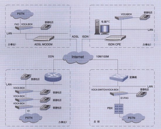 在總部、各個(gè)分公司、辦事處按照容量的大小可以安裝多臺(tái)VOCABOX,并利用VOCABOX自帶的FXO接口與本地PSTN網(wǎng)互通。