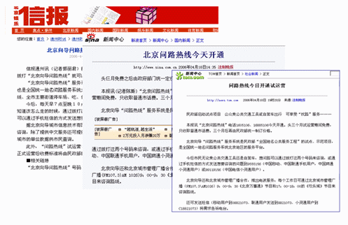 北京向?qū)峋經(jīng)過(guò)一個(gè)多月緊張的開通工作,終于于4月18號(hào)正式開通。新浪、網(wǎng)易、TOM等媒體爭(zhēng)相報(bào)道北京向?qū)У拈_通情況。 今后市民問路,可以通過(guò)撥打電話1605106、16885106這兩個(gè)號(hào)碼來(lái)咨詢,或通過(guò)手機(jī)短信的方式發(fā)送想要咨詢的問題到9555156中國(guó)移動(dòng)、中國(guó)聯(lián)通手機(jī)用戶,中國(guó)網(wǎng)通小靈通用戶或99119156中國(guó)電信小靈通用戶。