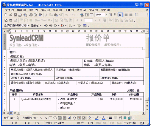 SynleadCRM企業(yè)版4.0很好地滿足了銷(xiāo)售自動(dòng)化管理、服務(wù)自動(dòng)化管理的上述需求,提供了開(kāi)放的客戶化Word模板,使得用戶企業(yè)能夠根據(jù)實(shí)際情況不斷擴(kuò)展該應(yīng)用。客戶化模板直接在Word中編輯,可直觀、方便地插入合并域字段或代碼,只要對(duì)Word稍加了解就可勝任模板維護(hù)工作。