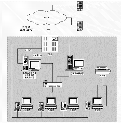 一臺(tái)Siemens Hipath交換機(jī):接入16條(2B+D)ISDN中繼線,設(shè)置人工座席分機(jī),為CTI、IVR語音服務(wù)器提供8路IVR端口。