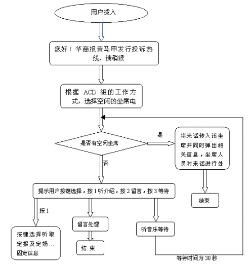 當(dāng)坐席全忙時(shí),IVR流程會(huì)引導(dǎo)用戶按鍵選擇聽取介紹、留言及聽音樂等待,用戶可按鍵選擇聽取介紹(包括定報(bào)及定奶的信息),聽完介紹用戶可按鍵選擇繼續(xù)聽介紹或轉(zhuǎn)人工服務(wù);用戶選擇留言時(shí),IVR流程會(huì)提示用戶留下電話及投訴內(nèi)容,有指定的坐席人員每天聽取留言并進(jìn)行處理,從而減少了由于話務(wù)量集中而坐席人員無法及時(shí)處理的投訴電話。用戶選擇等待時(shí)會(huì)聽到一段優(yōu)美的音樂,當(dāng)坐席有空閑時(shí)電話會(huì)被及時(shí)的轉(zhuǎn)入坐席由坐席人員進(jìn)行處理。