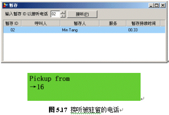 接通后,如果通話內(nèi)容很緊急而又不方便在會議室進(jìn)行溝通,此時,用戶可以按下話機(jī)上的“Park”按鈕,此時對方通話被導(dǎo)入到一段音樂(背景音中設(shè)定的音樂)。記住屏幕上提示的駐留號碼,即可掛機(jī):
