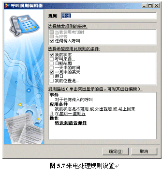 用戶可以設(shè)置一個或多個來電處理規(guī)則,來電處理規(guī)則能夠協(xié)助用戶處理來電,讓客戶得到最好的電話支持或服務(wù)。我們可以這么使用此功能,如:外出時將所有來電轉(zhuǎn)至語音信箱,節(jié)假日時將電話轉(zhuǎn)至手機(jī)等。