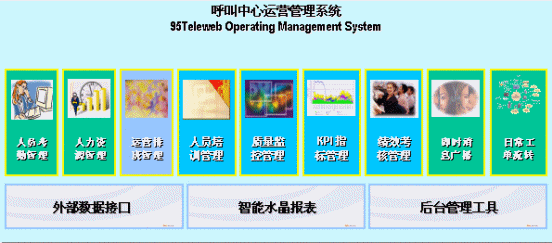 Teleweb-OMS運營管理系統(tǒng)共有11個模塊,涵蓋了動態(tài)質檢管理、培訓管理、考勤管理、人力資源管理、話務預測與自動排班、KPI管理、績效考核、部門間的需求單管理等各個環(huán)節(jié),并且提供了外部數(shù)據抽取功能和報表自動生成功能。