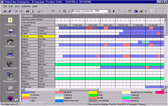 人員預(yù)測(cè)是一個(gè)每天、每周、每月、每年都需要作的工作計(jì)劃,為了能夠平衡呼叫中心人員的工作量和人員的可用性。通過將歷史數(shù)據(jù)和人員數(shù)據(jù)整合、加以分析,并借以WFMS體現(xiàn)出分配多少員工就可以達(dá)到既定的服務(wù)水準(zhǔn)。一旦需要員工數(shù)量被估算出來,那么工作安排也就是每天、每周、每月、每天的排班表的輪廓也就出來了。絕大多數(shù)的WFMS軟件的界面和操作都很相似,最主要的就是內(nèi)容就是要包含員工的姓名、員工的工作時(shí)間、員工的其他日程(最小單位是15分鐘),并且能夠提供具有多個(gè)管理軟件接口,和多種不同的管理方式。圖9.就是一個(gè)典型的人員排班表,以15分鐘為單位體現(xiàn)人員的工作安排。附加選項(xiàng)還可以包含"休假""遲到""曠工"等等,并且這排班表還可以通過歷史數(shù)據(jù)體現(xiàn)出哪個(gè)時(shí)段可能出現(xiàn)人員不足哪個(gè)時(shí)段容易出現(xiàn)人員過剩現(xiàn)象。