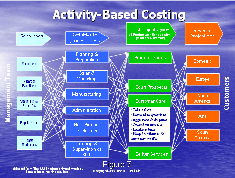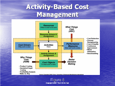 通過了解圖8,我們將以行動成本管理大體是什么的總括作為結(jié)束。我們從左邊的成本驅(qū)動因素開始——這是做工作的原因,例如:獲得客戶,維持客戶。就如圖4中所說的,這些成本驅(qū)動因素可以細(xì)分到工作行動上去。可以通過描述人,培訓(xùn),設(shè)備和技術(shù)資源來組成工作行動。資源驅(qū)動因素被用于分配這些企業(yè)成本到各個行動上去。下一步就是系統(tǒng)地確定行動驅(qū)動因素,分配行動成本到成本對象上去,這有利于決策的制定。例如,獲得一個客戶和維持一個客戶需要花費(fèi)多少的成本?