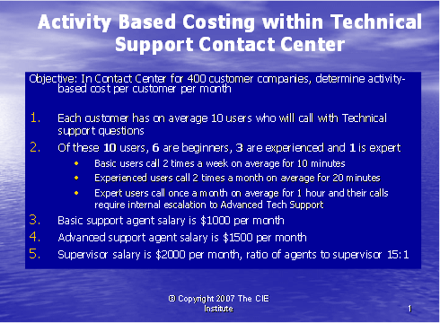 由于你懂得為了提高利潤而需做出的改變,因此可以更清楚地了解所付的成本。ABC提供了對呼叫中心良好運作至關(guān)緊要的見解。觀察一下現(xiàn)今你服務(wù)客戶花費了哪些成本。在你計算出平均一個客戶所花費的成本以后,再關(guān)注每一段和每一組客戶所花費的成本。你將對你所獲得的見解而感到驚訝,并對你為公司其他部門主管提供該信息所帶來的影響感到不可思議。