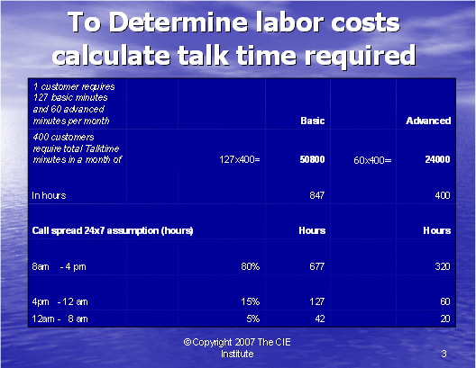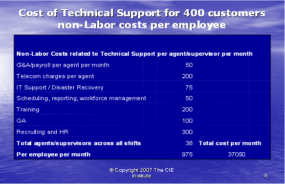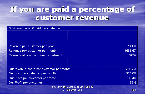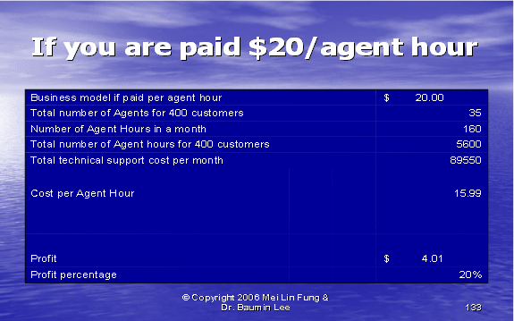 根據(jù)圖表12,我們可以算出第二種方式的利潤百分比。如果我們假設(shè)每個客戶每年的收入是20,000美元,其中分配給呼叫中心部門的收入是20%。我們每個客戶每月的收入是333.33美元,每個客戶月的成本是223.88美元(參見圖表10)。這導(dǎo)致我們來自每個客戶每月的利潤是109.46美元——這將產(chǎn)生33%的利潤率。