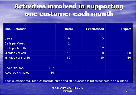 圖表2說明了我們?nèi)绾问褂眠@些數(shù)字去計算基礎(chǔ)和高級技術(shù)支持需要為每個客戶每月所花的通話時長。由于初級和有經(jīng)驗的客戶使用者可以由基礎(chǔ)技術(shù)座席支持,所以基礎(chǔ)技術(shù)支持座席每月所接電話為87+40=127分鐘,高級技術(shù)支持座席每月所接電話為60分鐘。
