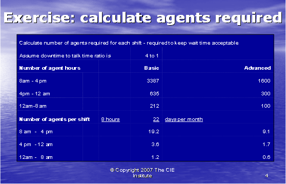 在我們計算出所需的座席數(shù)之前,我們必須了解一個座席的付薪工作時間和他的通話時長的區(qū)別,通話時長是座席真正花在電話上面對客戶的時間。一個座席不會一直處理電話,其它的時間用于培訓(xùn),休息,與主管獨處,部門會議,公司內(nèi)部為給客戶提供準(zhǔn)確的回答而進行研究,對內(nèi)對外寫郵件,準(zhǔn)備下一個客戶的電話。在每個呼叫中心中,通話時長和停工時長的比率是不同的。對于復(fù)雜易變的產(chǎn)品,花在培訓(xùn)上的時間會更多。在新產(chǎn)品被頻繁介紹的呼叫中心,就需要更多的時間去研究關(guān)于新產(chǎn)品的回答。為了更精確,一個座席一周的工作時長應(yīng)該與其通話時長相比較,以便真正確定通話時長與停工時長的比率。在我們的例子中,我們假設(shè)停工時長和通話時長的比率為4:1,也就是說,每1小時通話時間,相對應(yīng)4小時停工時間。