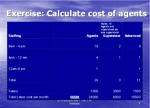 我們下一步就是計算出主管的成本。每次排班至少需要一個主管,如果這一排班的座席數(shù)要少一些,主管則也應(yīng)該能夠處理一些技術(shù)支持的電話。在這個例子中,我們將假設(shè)主管擁有高級支持座席的技術(shù)技巧。在圖表5中,你將看到我們使用了圖表4所得出的座席數(shù),并假設(shè)這是每次排班話務(wù)量中所需的各種類型員工的數(shù)量:基礎(chǔ),高級和主管。我們同時用圖表1中的薪資去計算座席和主管支持400個客戶的總成本。通過把每種座席單獨的成本相加(24個基礎(chǔ)座席,11個高級座席和3個主管),得出每月的人工成本為46,500美元。