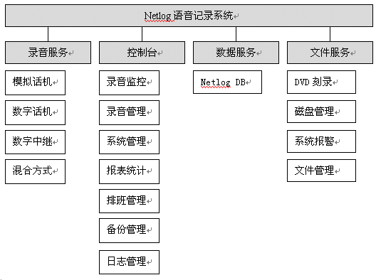 NetLog語音記錄系統(tǒng)采用基于分布式、多層控制管理體系的設(shè)計思想,將電話線路與內(nèi)部網(wǎng)絡(luò)有效地結(jié)合在一起,形成一套完整的語音錄制、管理系統(tǒng)。采用目前先進的C/S模型,能更方便、快捷地實現(xiàn)控制臺對網(wǎng)絡(luò)內(nèi)所有記錄服務的狀態(tài)監(jiān)視,記錄查詢,操作控制等,采用統(tǒng)一的管理化機制,使文件的管理和備份更簡潔。