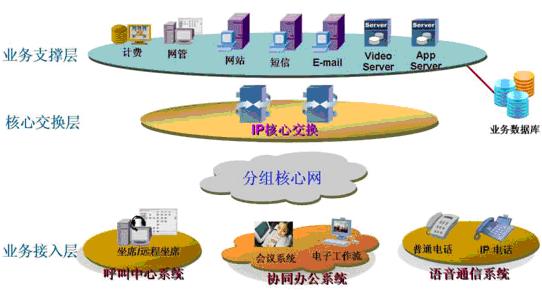 業(yè)務(wù)支撐層:計費、網(wǎng)管、多媒體視頻、應(yīng)用服務(wù)器等各種功能服務(wù)器。可與用戶的業(yè)務(wù)數(shù)據(jù)庫對接,為整個業(yè)務(wù)提供有力的支撐平臺。確保有效快速的處理呼叫流程、提高工作效率,評估呼叫中心的表現(xiàn)。