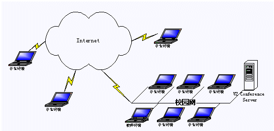 應(yīng)用V2 遠程教育平臺,教學(xué)和遠程培訓(xùn)都可以在線進行。學(xué)生和教師利用各自的客戶端通過網(wǎng)絡(luò),進入一個虛擬課堂,在教師與學(xué)生、學(xué)生與學(xué)生之間建立起語音和視頻的雙向交流、課件教學(xué)、在線會話和白板溝通的環(huán)境,實現(xiàn)教學(xué)功能。