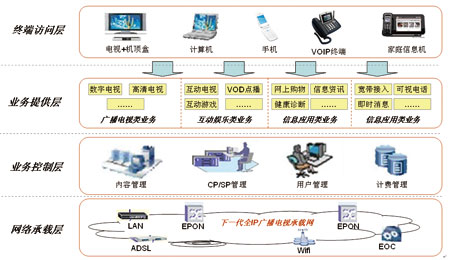 目前用戶是通過電視+機頂盒的方式享受廣電運營商提供的數(shù)字電視服務,而未來用戶可通過計算機、手機、VOIP終端、家庭信息機等多樣化的終端訪問廣電運營商所提供的寬帶接入服務、VOIP的語音服務、各種信息化應用服務。