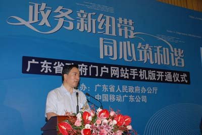 2009年8月7日,廣東省政府在廣州舉行省政府門(mén)戶網(wǎng)站手機(jī)版開(kāi)通儀式。省政府秘書(shū)長(zhǎng)徐尚武、中國(guó)移動(dòng)廣東公司總經(jīng)理徐龍?jiān)陂_(kāi)通儀式上致辭。