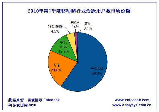 據(jù)易觀國際Enfodesk產(chǎn)業(yè)數(shù)據(jù)庫近期發(fā)布的《2010年第1季度中國市場移動IM數(shù)據(jù)監(jiān)測報告》研究顯示:2010年第1季度中國市場移動IM活躍用戶數(shù)環(huán)比增長超過18%,總數(shù)突破1.6億,累計賬戶數(shù)環(huán)比增長10.97%,總數(shù)超過3.8億,相比09年第4季度依然取得了較快的增長。但是基于整體市場來看,移動IM活躍用戶數(shù)市場格局并沒有發(fā)生太大變化,手機QQ仍然以59.6%的市占率名列市場第一,飛信、手機MSN位列二三名,具體市場占比及排名如下圖所示:CTI論壇編輯