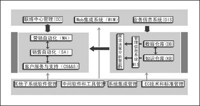 在信息技術(shù)管理子系統(tǒng)中,CRM的各功能模塊和相關(guān)系統(tǒng)運(yùn)行都必須由先進(jìn)的技術(shù)、設(shè)備、軟件來保障,主要的內(nèi)容可以分為以下四類:其他子系統(tǒng)應(yīng)用軟件管理,如數(shù)據(jù)庫管理系統(tǒng)、電子軟件分發(fā)系統(tǒng)等;中間軟件和系統(tǒng)工具的管理,如中間軟件系統(tǒng)、系統(tǒng)執(zhí)行管理工具等;企業(yè)級(jí)系統(tǒng)的集成管理,如CRM與企業(yè)管理信息系統(tǒng)的集成,乃至整個(gè)的企業(yè)應(yīng)用集成方案,以實(shí)現(xiàn)將企業(yè)的CRM與ERP、SCM等系統(tǒng)緊密集成;電子商務(wù)技術(shù)和標(biāo)準(zhǔn)的管理,如Internet技術(shù)、EDI技術(shù)及標(biāo)準(zhǔn)、通信標(biāo)準(zhǔn)的管理等。為支持無線應(yīng)用,CRM技術(shù)管理子系統(tǒng)將提供與手機(jī)、PDA、智能家電等工具的通訊接口,采用J2EE或.NET技術(shù)平臺(tái),以及在支持無線傳輸和無線LAN應(yīng)用等方面進(jìn)行相應(yīng)的調(diào)整。