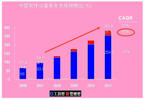 2006中國軟件運(yùn)營服務(wù)(SaaS)產(chǎn)業(yè)的規(guī)模為68億元,2011年將突破400億,達(dá)到406億元,未來五年的復(fù)合增長率達(dá)到43%。這是國內(nèi)ICT領(lǐng)域權(quán)威研究機(jī)構(gòu)計(jì)世資訊(CCW Research)在其最新發(fā)布的《軟件業(yè)的下一個十年——中國軟件運(yùn)營服務(wù)(SaaS)市場發(fā)展趨勢研究報(bào)告》中指出的。