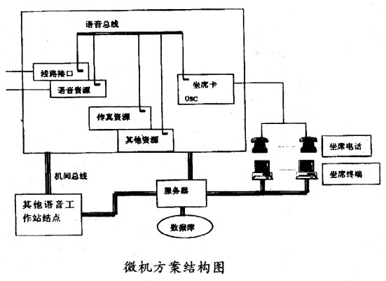 ____這種方案以近幾年發(fā)展迅速的微機(jī)語音處理技術(shù)為基礎(chǔ),其基本思想是在微機(jī)平臺(tái)上 集成各種功能的語音處理卡,完成通信接口、語音處理、傳真處理、坐席轉(zhuǎn)接等功能,再 結(jié)合外部的計(jì)算機(jī)網(wǎng)絡(luò)實(shí)現(xiàn)各種應(yīng)用系統(tǒng)的需求。