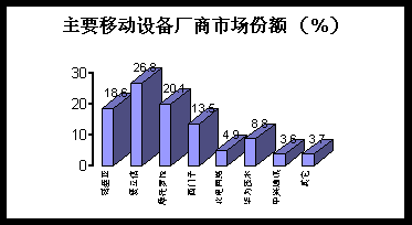 (3)市場趨勢及預(yù)測: 2001年移動網(wǎng)絡(luò)設(shè)備市場預(yù)計總體保持快速增長,在GSM領(lǐng)域,中國移動25城市GPRS實驗網(wǎng)的開通,對移動互聯(lián)將是實質(zhì)性的推動,WAP熱炒冷賣的局面會有所改變。各大設(shè)備廠商受此影響將沉浮巨大,愛立信、諾基亞、摩托羅拉、華為技術(shù)等公司將順勢擴大市場份額,市場集中度進(jìn)一步提高。