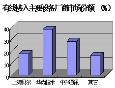 (2)市場特點:窄帶接入仍然是有線接入市場的主流,以Honet、ZXA10為代表的窄帶有線接入占市場90%以上的份額。xDSL、HFC、LMDS、千兆以太網(wǎng)技術(shù)等寬帶接入雖然熱浪涌動,但限于種種原因尚未大規(guī)模商用。中興通信、華為技術(shù)、上海貝爾穩(wěn)居有線窄帶接入市場三甲地位,市場份額之合占市場總量的83.6%。各自市場份額依次為27.8%、38.0%、17.8%。無線市話接入設(shè)備市場基本是UT斯達(dá)康、青島朗訊、中興通訊等幾家公司的天下,市場份額之合占市場總量的86.4%,各自市場份額依次為32.6%、24.3%、29.5%