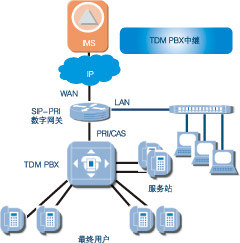 眾多企業(yè)隨著業(yè)務(wù)的擴(kuò)張,開設(shè)了大量的分支機(jī)構(gòu),企業(yè)總部以及分支機(jī)構(gòu)之間的語音溝通非常頻繁,企業(yè)長途電話費(fèi)用是企業(yè)經(jīng)營成本中的一項(xiàng)巨大開支。現(xiàn)階段,多數(shù)的企業(yè)客戶,包括大型和中、小型企業(yè)基本上都采用PBX作為企業(yè)內(nèi)部的通信方式,該方案有天然的優(yōu)越性,如短號互撥、電腦話務(wù)員、DID等功能,但也有弊端:占用機(jī)房面積大、維護(hù)困難并且不能解決異地長途通話問題。隨著科技的發(fā)展和寬帶接入的普及,幾乎每個(gè)企業(yè)及其分支機(jī)構(gòu)都有互聯(lián)網(wǎng)接入,因此借助現(xiàn)有互聯(lián)網(wǎng),節(jié)約長途電話成本,日漸成為公司的重要選擇。端到端的多媒體通信和辦公系統(tǒng)的有機(jī)結(jié)合成為更多新型企業(yè)的期待。圖1 TDM PBX Trunking 接入方案