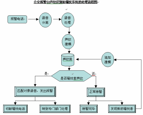 公安報警臺聲紋識別防騷擾系統(tǒng)的處理流程為: