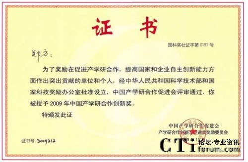 CTI論壇(ctiforum)11月26日消息(記者 潘婷):2009年11月7日,得意公司董事長鄭方博士獲中國產(chǎn)學研合作促進會2009年度中國產(chǎn)學研合作創(chuàng)新獎。該獎勵是面向國內(nèi)在促進產(chǎn)學研合作及創(chuàng)新方面做出突出貢獻的單位及個人所頒發(fā)的年度榮譽獎。CTI論壇報道