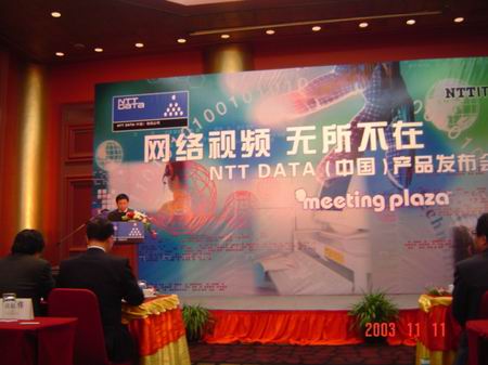 2003年11月11日,NTT DATA(中國(guó))有限公司,在長(zhǎng)城飯店舉行了名為“網(wǎng)絡(luò)視頻——無所不在”的產(chǎn)品發(fā)布會(huì)。會(huì)上,NTT DATA(中國(guó))有限公司正式推出了一款網(wǎng)絡(luò)視頻軟件產(chǎn)品——“MeetingPlaza”。此產(chǎn)品開拓了視頻系統(tǒng)在圖像效果、控制靈活度以及性價(jià)比上的全新應(yīng)用模式。該產(chǎn)品的開發(fā)商N(yùn)TT-IT,自2001年6月起在日本開始系統(tǒng)的銷售及提供ASP服務(wù)。到現(xiàn)在已經(jīng)向500家以上的日本企業(yè)及地方政府提供了服務(wù),在日本深受好評(píng)。在中國(guó),雖然軟件視頻會(huì)議系統(tǒng)還處在起步階段,但依據(jù)未來視頻通訊的廣大需求,以及“MeetingPlaza”具有的投入成本低、限制少和適用性強(qiáng)的特點(diǎn),都將使該產(chǎn)品更加具有市場(chǎng)潛力。