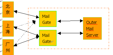 1. 正常工作時北京的內(nèi)部郵件服務器通過Mail Gate 1與外部郵件服務器通訊,上海、廣州通過 Mail Gate 2與外部郵件服務器通訊;