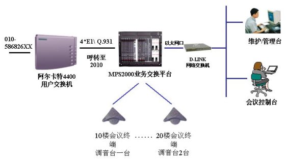 該會議系統(tǒng)通過4個數(shù)字中繼,與國電原有的阿爾卡特4400用戶交換機互連,通信采用Q.931信令。4路4線實現(xiàn)會議終端的接入,現(xiàn)使用3路,1路接國電10樓的調(diào)音臺,2路接20樓的調(diào)音臺,實現(xiàn)會議室擴音設(shè)備的接入。通過以太網(wǎng)口與D-LINK網(wǎng)絡(luò)交換機互連,接入國電集團的局域網(wǎng),實現(xiàn)維護管理及會議控制等功能。國電集團的會議接入號為:010-586826XX,因原有交換機的功能局限,以該接入號到交換機后自動呼轉(zhuǎn)到2010進入MPS2000會議系統(tǒng),實現(xiàn)會議的呼入。