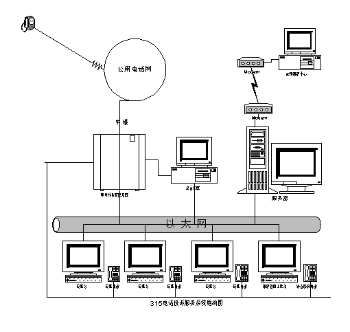 ZQ-315電話投訴服務(wù)系統(tǒng)由如下各部分組成: 4呼叫排隊(duì)交換系統(tǒng) 4座席臺(tái) 4數(shù)據(jù)庫(kù)服務(wù)器 4系統(tǒng)維護(hù)管理臺(tái) 4同步數(shù)字錄音系統(tǒng) 4遠(yuǎn)程通訊模塊 4遠(yuǎn)程維護(hù)終端 各部分通過集線器和五類雙絞線組成快速以太網(wǎng);各節(jié)點(diǎn)之間采用TCPAP協(xié)議,以 Socket方式進(jìn)行通訊。其組成結(jié)構(gòu)如下圖所示。 ![]() 1.呼叫排隊(duì)交換系統(tǒng) 4與公用電話網(wǎng)相連,將來話分配到座席臺(tái)或遇忙排隊(duì) 4自動(dòng)應(yīng)答來話,完成自動(dòng)受理投訴與自動(dòng)查詢服務(wù) 4進(jìn)行呼叫轉(zhuǎn)移 2.座席臺(tái) 4人工應(yīng)答來話 4顯示主叫號(hào)碼、戶主與地址等信息(根據(jù)需要) 4計(jì)算機(jī)輔助投訴受理 4計(jì)算機(jī)輔助業(yè)務(wù)咨詢(法律。個(gè)案等) 3.?dāng)?shù)據(jù)庫(kù)服務(wù)器 4運(yùn)行網(wǎng)絡(luò)操作系統(tǒng) 4運(yùn)行數(shù)據(jù)庫(kù)系統(tǒng) 4提供各種數(shù)據(jù)服務(wù) 4對(duì)網(wǎng)絡(luò)安全性進(jìn)行檢查控制 4.系統(tǒng)維護(hù)管理臺(tái) 4對(duì)數(shù)據(jù)庫(kù)進(jìn)行維護(hù)管理 4查詢各種業(yè)務(wù)數(shù)據(jù),生成統(tǒng)計(jì)報(bào)表。 5.同步數(shù)字錄音系統(tǒng) 4將模擬話音轉(zhuǎn)換成數(shù)字信號(hào),并壓縮存儲(chǔ)。多路錄音,互不干擾 4支持多種語音數(shù)據(jù)壓縮格式(如PCMchDPCM、WAV等) 4播放放音 6.遠(yuǎn)程通訊模塊 4與上級(jí)或遠(yuǎn)程系統(tǒng)進(jìn)行通訊。 7.遠(yuǎn)程維護(hù)終端 4遠(yuǎn)程撥號(hào)登陸系統(tǒng),對(duì)系統(tǒng)進(jìn)行全面維護(hù) |