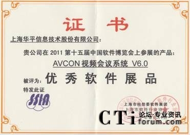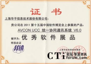 CTI論壇(ctiforum)6月1日消息(記者 潘婷婷): 近日,由工業(yè)和信息化部、國(guó)家發(fā)展和改革委員會(huì)、科學(xué)技術(shù)部、國(guó)家外國(guó)專家局和北京市人民政府共同主辦,中國(guó)軟件行業(yè)協(xié)會(huì)、中國(guó)電子信息產(chǎn)業(yè)發(fā)展研究院等單位承辦的第十五屆中國(guó)國(guó)際軟件博覽會(huì)參評(píng)軟件產(chǎn)品評(píng)獎(jiǎng)揭曉,經(jīng)過(guò)專家組的嚴(yán)格評(píng)審及在技術(shù)領(lǐng)先性、應(yīng)用價(jià)值等評(píng)審指標(biāo)下,由上海市經(jīng)信委軟件展團(tuán)及上海市軟件行業(yè)協(xié)會(huì)共同頒發(fā)華平股份優(yōu)秀組織獎(jiǎng),所參展的 “AVCON UCC統(tǒng)一協(xié)同通訊系統(tǒng)V6.0”、“AVCON視頻會(huì)議系統(tǒng)V6.0”兩款產(chǎn)品被評(píng)為優(yōu)秀軟件展品。CTI論壇報(bào)道
