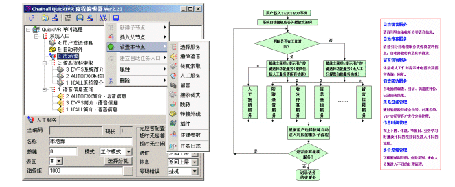 產品化、標準化、全功能、低價位,易于安裝使用,便于應用集成,為用戶實現(xiàn)呼叫中心應用節(jié)省了大量的資金、人力、時間;無需編程,可自定義呼叫服務流程,豐富的業(yè)務插件可以直接配置訪問后臺數(shù)據(jù)庫,滿足各類應用需要;組件式構造,易于擴容和功能擴展。