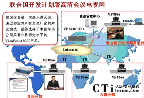 聯(lián)合國開發(fā)計劃署采用了華為ViewPoint® 8000綜合視訊系統(tǒng),視頻會議采用業(yè)界最新的H.264視頻編碼技術(shù),節(jié)省了線路帶寬資源,同時獲得了清晰、流暢的圖像;該視訊會議系統(tǒng)同時融合了IP語音系統(tǒng),擴展了視頻會議覆蓋的范圍,實現(xiàn)了視頻會議、電話會議和電視電話混合會議;視訊會議系統(tǒng)建成后,以清晰的聲音、圖像和通過H.239雙流實現(xiàn)的PC桌面真實還原,實現(xiàn)了聯(lián)合國開發(fā)計劃署遠(yuǎn)程會議、協(xié)同審批文件等。
