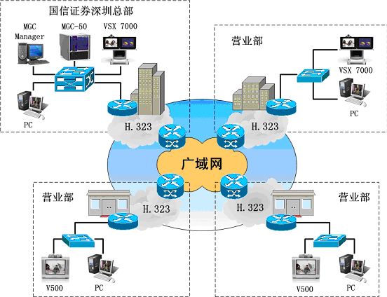 國信證券有限責任公司為全國性大型綜合類證券公司,總部在深圳,在全國二十一個城市擁有二十多家營業(yè)部及服務(wù)網(wǎng)點。隨著國信證券規(guī)模的不斷擴大和內(nèi)外交流的增加,公司領(lǐng)導希望借助視頻會議的高效、快捷等特點,提高管理效率、統(tǒng)一管理、降低企業(yè)的管理運作成本、減少公司的巨額通訊費用和差旅費用。