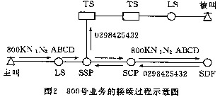 -- 用戶在撥打800號(hào)業(yè)務(wù)用戶號(hào)碼時(shí),首先由網(wǎng)絡(luò)點(diǎn)上的普通電話交換機(jī)接收,并把800KN1 N2 ABCD號(hào)碼經(jīng)話路傳送給業(yè)務(wù)交換點(diǎn)SSP,再由SSP將此號(hào)碼經(jīng)No.7信令鏈路送到業(yè)務(wù)控制點(diǎn)SCP,SCP通過(guò)在業(yè)務(wù)數(shù)據(jù)庫(kù)SDP中查尋譯碼表將此號(hào)碼翻譯成普通的電話號(hào)碼回送SSP,最后由SSP負(fù)責(zé)完成電路的連接,該過(guò)程如圖2所示。