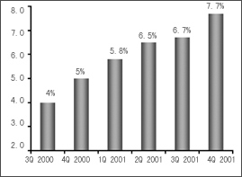 在美國的泡沫經(jīng)濟破滅、市場極度低迷的時候,歐洲又傳來第三代無線通信技術(shù)——WCDMA因產(chǎn)品、市場等諸多原因全面推遲的消息,這對本來就處于蕭條狀態(tài)的全球通信業(yè)來說,無疑雪上加霜。業(yè)內(nèi)人士在不斷地尋找和探討,究竟什么樣的需求才是目前市場的驅(qū)動力?究竟什么樣的技術(shù)才能真正體現(xiàn)市場價值呢?KTF數(shù)據(jù)收入與總收入的比例