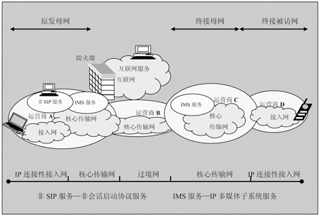 如圖3所示,與一個被訪問的網(wǎng)不同,IP多媒體子系統(tǒng)還支持母網(wǎng)的概念。在這個例子中,母網(wǎng)是支持具有登錄權(quán)的IP多媒體子系統(tǒng)的核心網(wǎng)。被訪問的網(wǎng)是當(dāng)前向用戶提供IP多媒體子系統(tǒng)服務(wù)連接的網(wǎng)。圖3中的運營商A擁有許多疊接網(wǎng)用戶的母網(wǎng),而運營商C擁有移動電話的母網(wǎng),而用戶正在運營商D的網(wǎng)絡(luò)中漫游。
