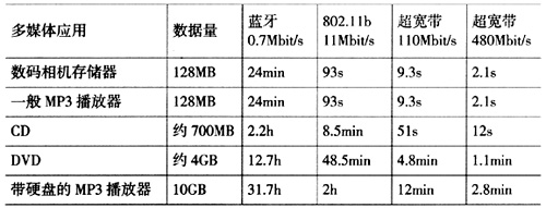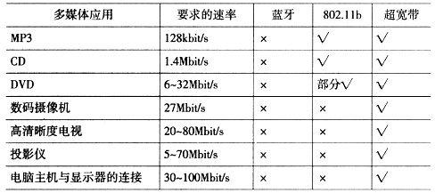 2.0接口相當(dāng),遠(yuǎn)遠(yuǎn)高于無線局域網(wǎng)802.11b的11 Mbit/s,也比下一代無線局域網(wǎng)802.11a/g的54 Mbit/s高出近一個(gè)數(shù)量級(jí)。UWB通信的功耗較低,能更好地滿足使用電池的移動(dòng)設(shè)備的要求。另外,UWB信號(hào)的功率譜密度非常低,信號(hào)難以被檢測(cè)到,再加上采用的跳頻、直接序列擴(kuò)頻等擴(kuò)頻多址技術(shù),使非授權(quán)者很難截獲傳輸?shù)男畔ⅲ蚨踩苑浅:谩1?是一些典型的實(shí)時(shí)多媒體應(yīng)用對(duì)不同無線傳輸技術(shù)的數(shù)據(jù)傳輸速率的要求。從表中可以看出,如果采用無線的方式來進(jìn)行傳輸,只有UWB技術(shù)可以滿足各種應(yīng)用的要求。