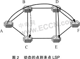 用圖2所示的6節(jié)點光網(wǎng)絡來闡述整個組播信令流程。與IP組播不同,點到多點LSP并不需要額外的組播組管理協(xié)議。這是因為葉子節(jié)點的地址直接被包括在請求中,而不像IP組播中僅僅只是使用一個D類地址。所有的組播樹請求都將用一個三元組來表示{T,a,L},其中T是組播樹的標識符,s是源節(jié)點,L是組播樹的葉子集合。當T等于O的時候意味著這是一個組播樹建立請求。例如,源節(jié)點A希望建立一個到葉子E和F的組播樹,那么這個請求就被表示為{0,A,{E,F(xiàn)}}。當這顆樹被建立后,它將被分配一個全局唯一的標識符,比如1。請求{1,A,{C1}}和{1,A,{F}}則分別意味著將葉子C嫁接到組播樹1和將葉子F從組播樹1中剪除。如果想刪除整棵樹,只需要將組播樹1的所有葉子都剪除即可,即{1,A,{C,E}}。