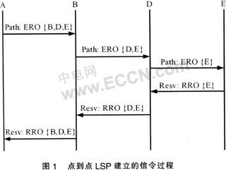 ASON控制平面是基于通用多協(xié)議標記交換(GMPLS:Generalized Multi-Protocol Label Switching)協(xié)議體系,并采用流量工程(TE:Traffic Engineering)策略。ASON控制平面主要具備有三種基本功能:資源發(fā)現(xiàn)、路由控制、連接管理。資源發(fā)現(xiàn)功能負責自動發(fā)現(xiàn)網(wǎng)絡中各種可使用資源,在GMPLS框架中由鏈路管理協(xié)議實現(xiàn)。路由控制功能負責實現(xiàn)自動拓撲發(fā)現(xiàn)并為業(yè)務請求進行路由選擇,運營商可以根據(jù)不同的TE策略對業(yè)務流的路徑進行精確控制,不受基于IGP的最短路徑約束。GMPLS框架中對已有的OSPF/ISIS協(xié)議進行了TE擴展以實現(xiàn)路由信息的擴散。連接管理功能負責為業(yè)務請求提供端到端的連接服務,用戶可以通過用戶網(wǎng)絡接口(UNI)向ASON發(fā)送請求完成包括連接的建立、刪除、修改和查詢等各種操作。目前存在兩種主要的信令協(xié)議來實現(xiàn)連接管理:基于約束路由的標記分發(fā)協(xié)議(CR-LDP:Constraint-based RoutedLabel Distribution Protocol)和基于流量工程擴展的資源預留協(xié)議(RSVP-TE:Resource Reservation ProtocolTraffic Engineering)[2,3]。IETF針對這兩種協(xié)議都給出了相應的RFC,但都只限于對點到點連接的支持。考慮到目前RSVP-TE得到了更多運營商和設備廠商的支持,我們也將基于RSVP-TE進行相應的組播擴展。RSVP-TE有兩種基本消息類型:Path消息和Resv消息。圖1顯示了一個簡單的點到點標記交換通道(LSP:Label Switching Path)建立的信令過程。當入口標記交換路由器(LSR:Label Switching Router)A接收到一個業(yè)務請求后,它根據(jù)路由控制模塊計算出來的路由填寫顯示路由對象(ERO:Explicit Route Object):{B,D,E},然后將此ERO寫入到一個新建的Path消息中。這個Path消息中還會包含一個會話(SESSION)對象用來全局唯一標識這個LSP所屬的隧道(tunnel),此對象由出口LSR的地址和隧道標識符組成。當Path消息構(gòu)建完后,它將沿著指定的路由向下游節(jié)點傳送一直到出口LSRE。出口LSR收到Path消息后向上游節(jié)點返回Resv消息。收到Resv消息的中間節(jié)點將負責填寫記錄路由對象(RRO:Record Route Object),記錄LSP的實際路由并分配標記。當入口LSR收到Resv消息后,這條點到點的LSP就建立成功了。